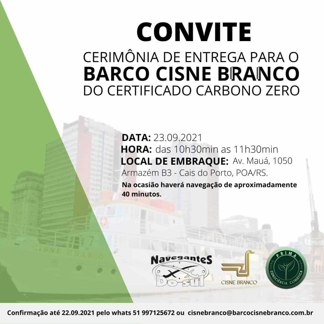 No aniversário do Barco Cisne Branco registramos os frutos dos ODS/ONU, Objetivos Desenvolvimento Sustentável. Dia 23 de setembro de 2021 a empresa e a cidade de Porto Alegre recebiam o professor Ricardo Harduim, da OSCIP PRIMA, durante um passeio pelas ilhas do Guaíba. A certificação incluiu treinamento para tripulantes e colaboradores PEAT, Programa de Educação Ambiental do Trabalhador inspirado no trabalho do jornalista porto-alegrense Wilmar Berna, agraciado com o reconheceimento ONU 500.